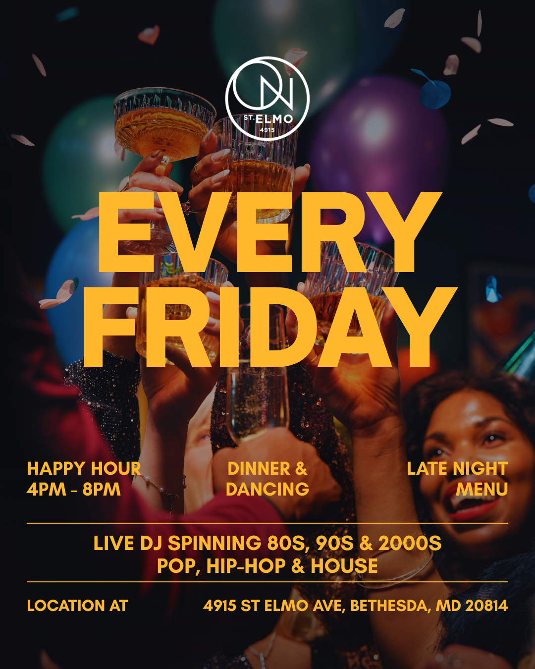 Make Friday night in Bethesda effortless and elevated at ON St. Elmo. Join us every Friday for a luxury lounge atmosphere featuring Happy Hour from 4PM to 8PM, followed by Dinner & Dancing with a Live DJ spinning the best hits from the 80s, 90s, and 2000s. Expect a curated mix of pop, hip-hop, and house, designed to set the mood early and keep the energy going late.