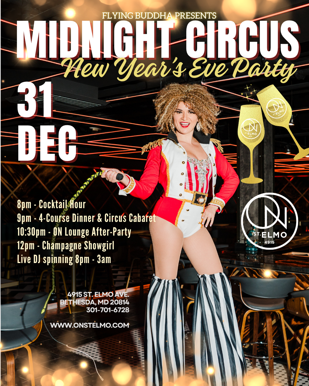 Experience an enchanted Winter Wonderland at ON St. Elmo. Enjoy a night of dinner, drinks, and dazzling performances as Flying Buddha’s students and teachers take the stage with aerial hammock, lyra, moon, chains, and pole routines that sparkle with grace, power, and festive flair.