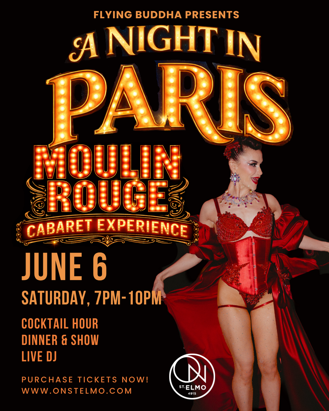 Step into Parisian glamour at A Night in Paris: Moulin Rouge, an immersive cabaret dining experience at ON St. Elmo in downtown Bethesda. Enjoy a high-energy evening of immersive live entertainment, seductive performances, and a pre-fixe dinner served alongside show. The night begins with cocktail hour and unfolds with burlesque, aerial and theatrical acts, along with a mystical fortune teller to enchant and intrigue, all set to music by a live DJ throughout the entire experience. As the final act concludes, the energy rises into a late-night discotech for guests to stay and dance after the show. Dress in your most glamourous Parisian-inspired look and indulge in a night of decadence and entertainment. Tickets include: Passed hors d’oeuvres during cocktail hour, cabaret show with pre-fixe dinner. There will be a cash bar for cocktails and beverages.